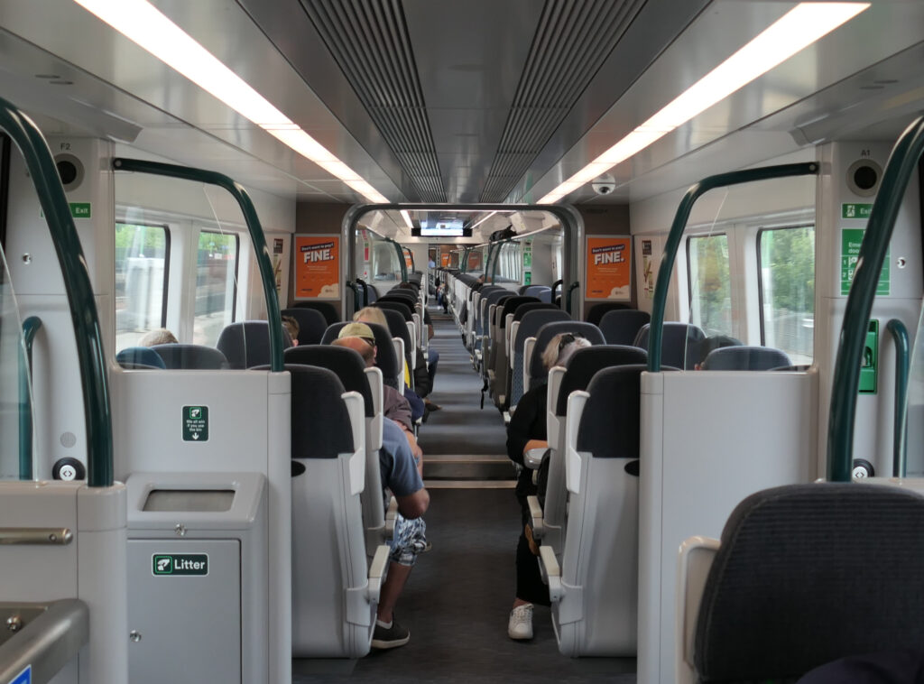 “On-board, the train felt quiet, and the seats seemed to be comfortable but somewhat upright. It is impressive looking along the train, with its longer cars (24 metres compared with 20 metres) and open wide gangways. The ride was smooth, and it was easy to walk from car to car in response to automated announcements saying that only the doors on cars one to seven would open at Northampton. In the event, the platform was more than long enough, and all the doors opened. Apparently this is a software bug.