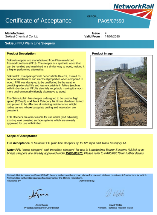 In 2025, NWR awarded Sekisui full certification for FFU Plain Line sleepers for speeds up to 125mph and approved its use on all track categories up to Category 1A. This is a major milestone in Sekisuiโs development of the UK business, giving us the opportunity to offer our client a plain line FFU product that can cover all speeds and categories of track.
