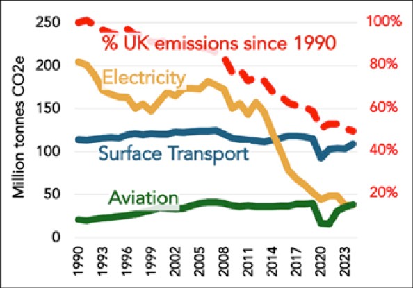 In 2024, aviation’s greenhouse gas (GHG) emissions were 38 million tonnes of carbon dioxide equivalent gases (MtCO2e). In addition, the global warming effect of aircraft contrails is at least as harmful as GHG emissions. Aviation now accounts for 8% of UK GHG emissions which makes it the UK’s sixth highest-emitting sector. This is not surprising, as a transport mode that lifts its passengers seven miles up and propels them at 500mph will always require much more energy than surface transport.