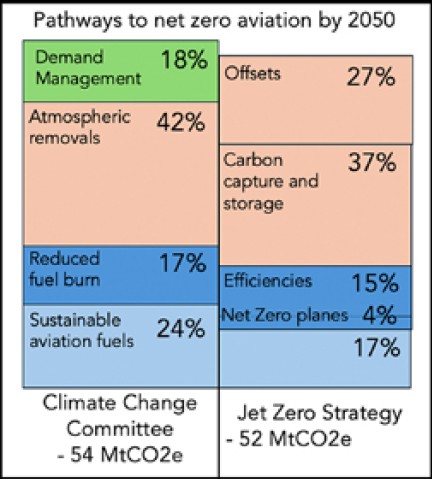 The JZS also considers that, after implementing aircraft GHG emission reduction measures, the remaining residual emissions will have to be sucked out of the atmosphere. It predicts that this will be done by removing 19 MtCO2e by direct air carbon capture and storage (DACCS) and 14 MtCO2e by offsetting schemes (forestry and renewable energy). In this way the JZS believes that aviation net zero can be achieved by 2050 without any requirement to limit aviation growth.