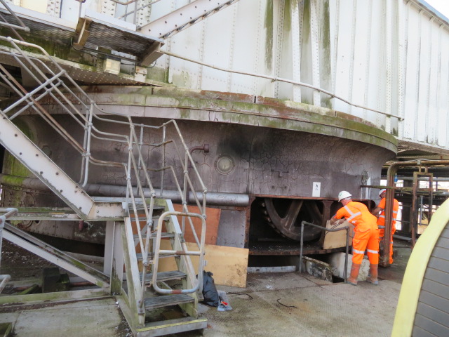 New pedestrian walkways were installed along the pier protection fendering, providing better access to cable trays for navigation lighting around the fenders, and to the bridge turning equipment. Normally, access to the turning engines and gears is down a ladder from track level, but for the renovation works two of the curved side panels to the top of the pier were temporarily removed to give greatly improved access to the crowded interior.