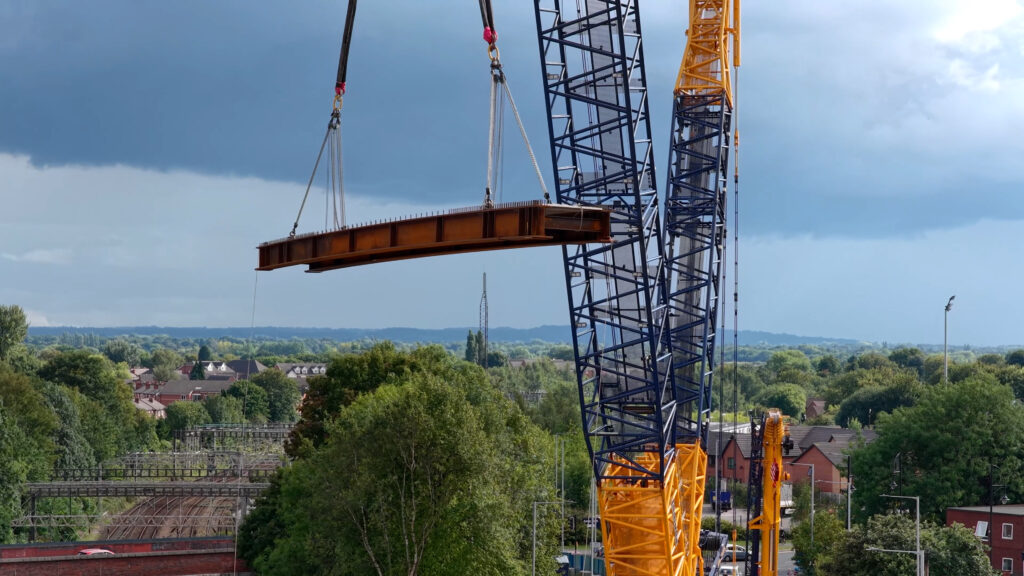 The 200 old concrete beams were then removed using two huge crawler cranes with a combined capacity of 1,300 tonnes and a lifting height of 196 metres. The redundant bridge beams were placed to the ground and taken off site by a fleet of 67 heavy goods vehicles. The new large steel and concrete beams were driven piece by piece and escorted by police escort and craned into position over a four-day period.