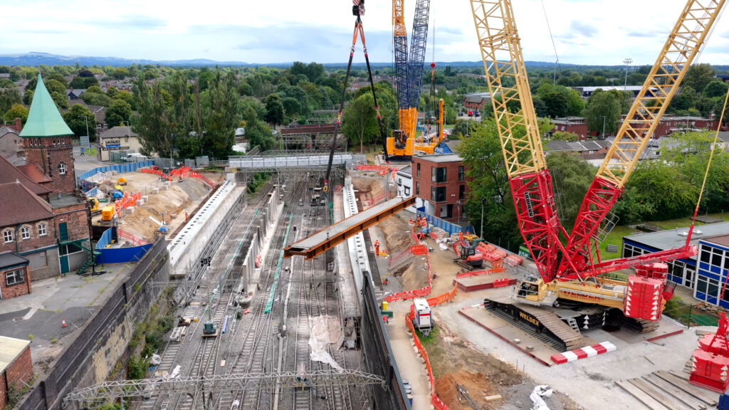 August 2025 saw the 21-day closure of the railway through Stockport, as part of the £20 million scheme to rebuild the Greek Street bridge (CMP2/1A) over the five-track electrified West Coast Main Line (WCML). The bridge is located just south of Stockport station on Engineers Line Route (ELR) CMP2 at 294.181km (182 miles, 1425 yards).