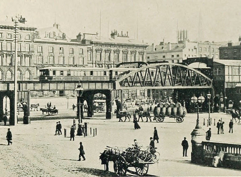 The first UK main line to be electrified was the Liverpool Overhead Railway which used a 525V DC third rail system. It was also the world’s first elevated railway when it opened in 1893 and was subsequently extended over the full 10km length of Liverpool’s docks. Steam-haulage was too heavy for its overhead structures and presented a fire risk to the dock’s inflammable cargos.