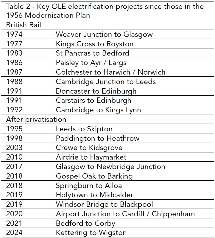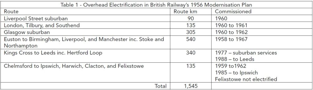 Within its 15-year period, the plan envisaged 400 route km of Southern third rail electrification and 1,500 route km of 25kV overhead electrification (as shown in the table), though it noted that many more main-line services had a traffic density that gave them a good economic case for electrification.